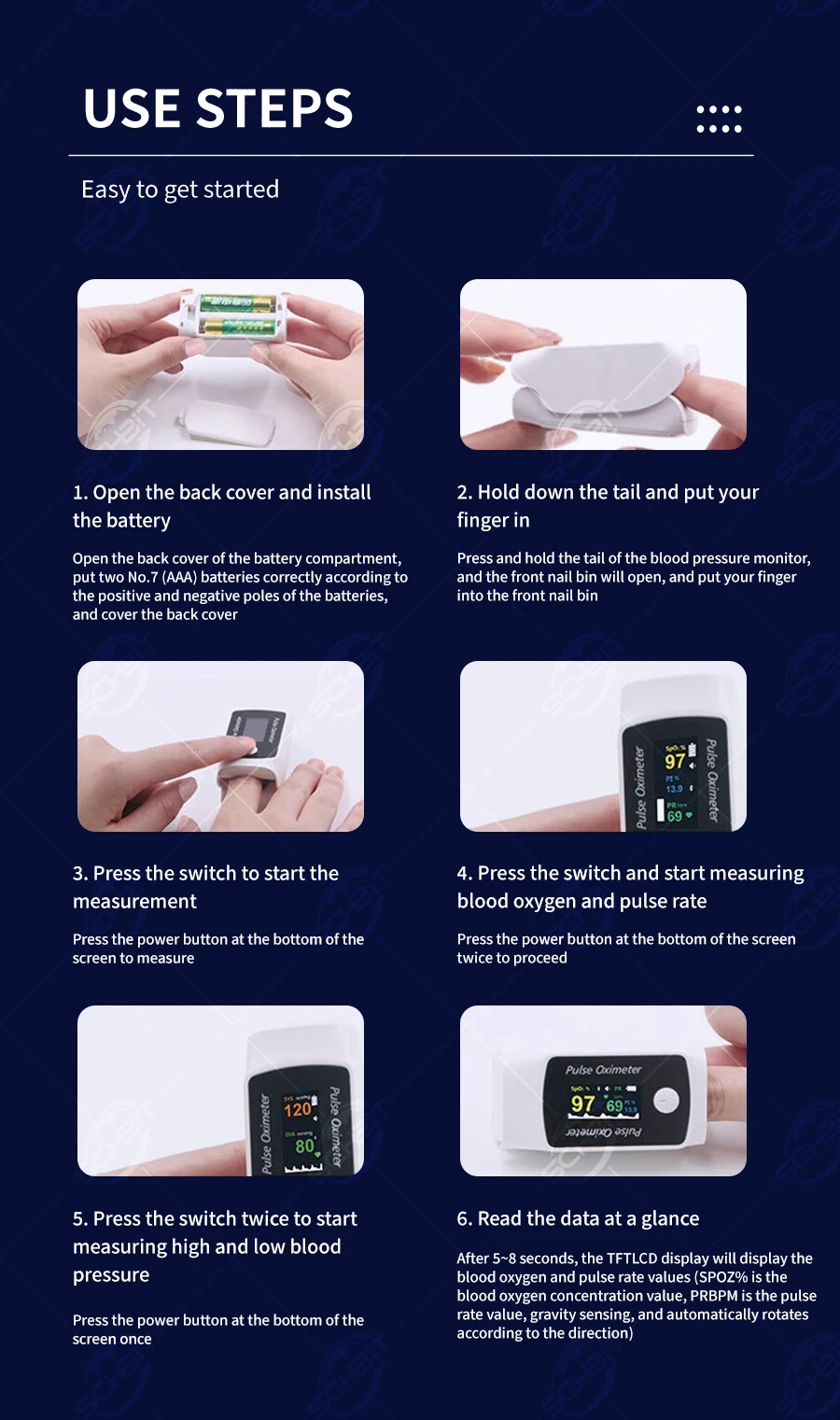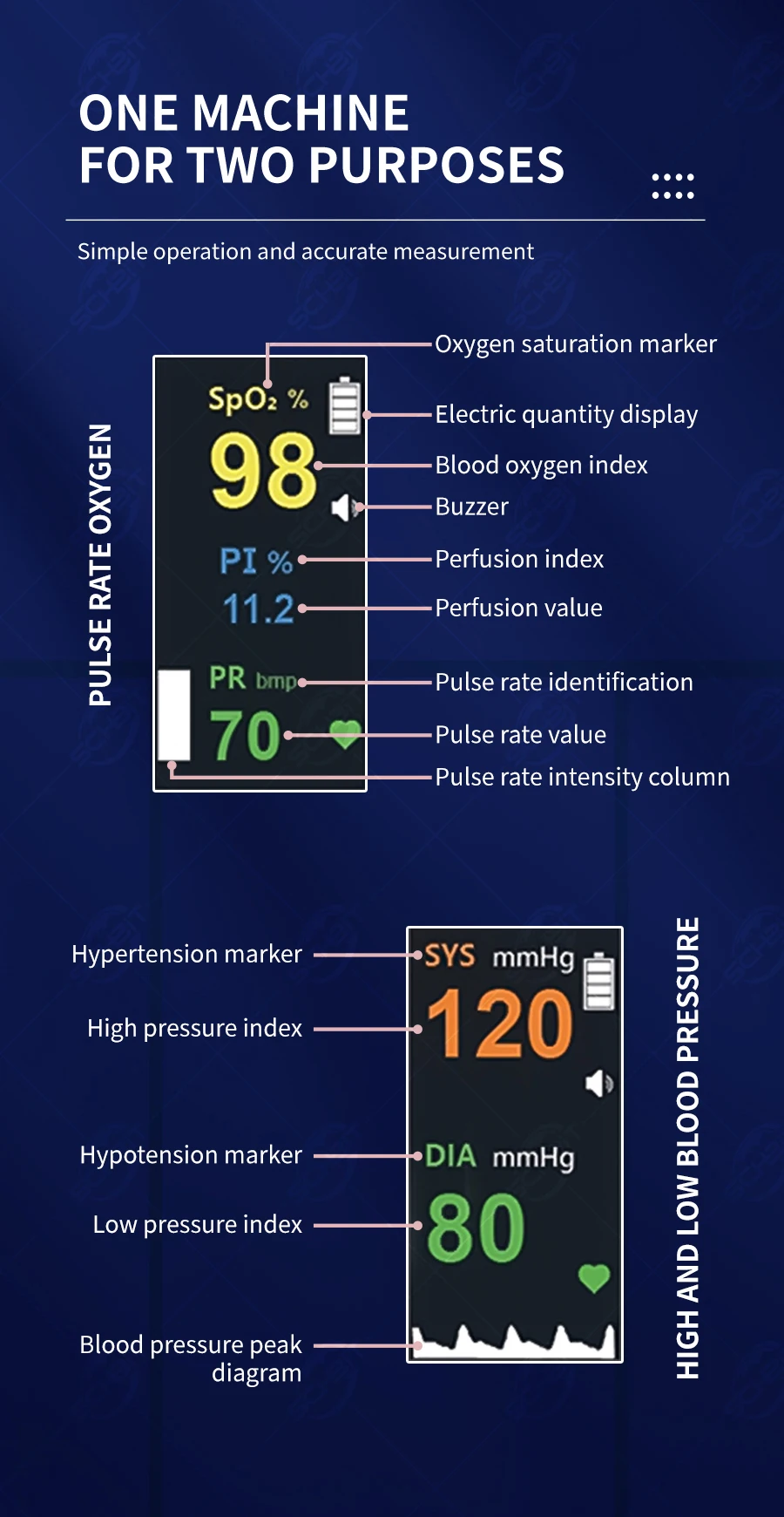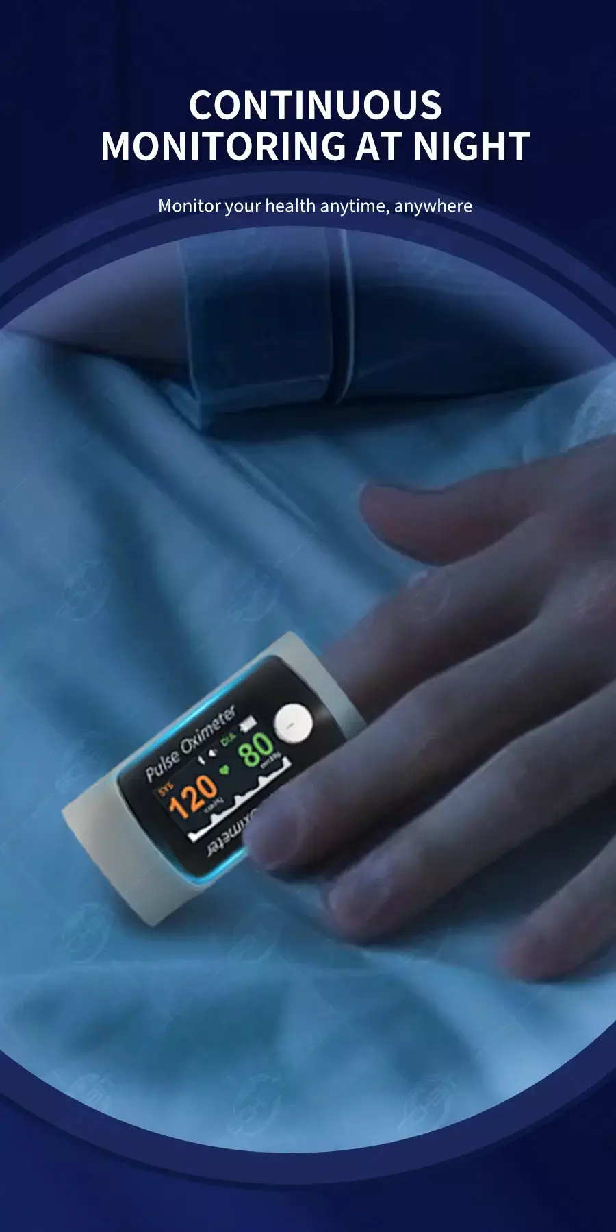 A Medição Contínua da Pressão Arterial de BM1300 é uma oi-tecnologia totalmente nova baseada no algoritmo do oxigênio do sangue; que é totalmente diferente da medida tradicional da pressão sanguínea, e a precisão da pressão sanguínea não pode ser avaliada pela medição tradicional da pressão arterial. O BM1300 é usado principalmente para observar a pressão arterial mudando a tendência e a comparação de dados históricos em seu aplicativo e medir spo2, pulso e índice de pufusão.